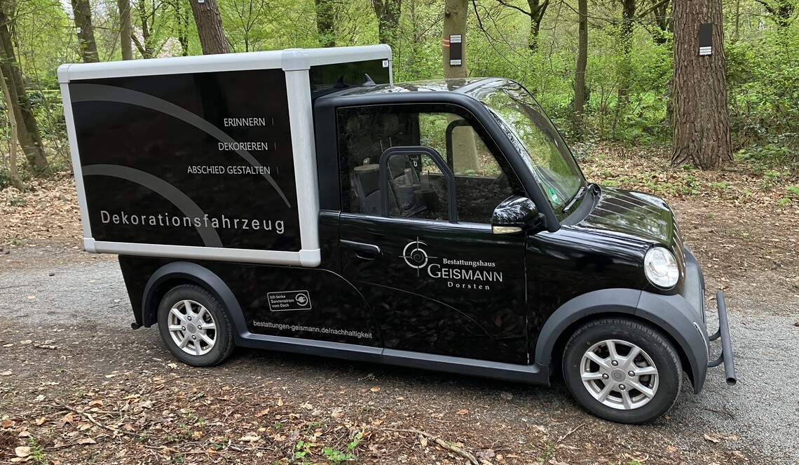 Für den Transport von Dekorationselementen auf Friedhöfen nutzen wir seit 2025 ebenfalls ein vollelektrisches Fahrzeug.
